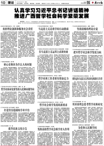 5月23日,广西社科联组织广西社科界部分专家学者召开座谈会,深入学习习近平总书记在哲学社会科学工作座谈会上的重要讲话精神,会上专家学者踊跃发言,畅谈学习体会,我校马克思主义理论研究与建设工程基地钟瑞添教授作了题为《在马克思主义运用上求新突破》的发言,5月31日的《广西日报》全文刊发。