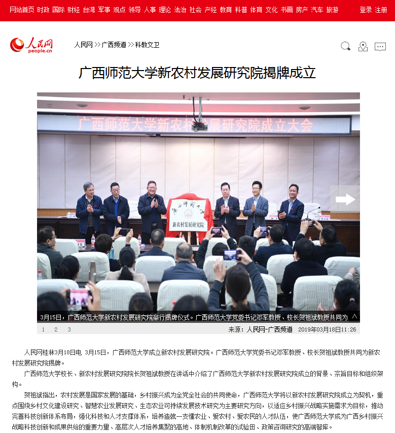 人民网桂林3月18日电 3月15日,广西师范大学成立新农村发展研究院。广西师范大学党委书记邓军教授、校长贺祖斌教授共同为新农村发展研究院揭牌。