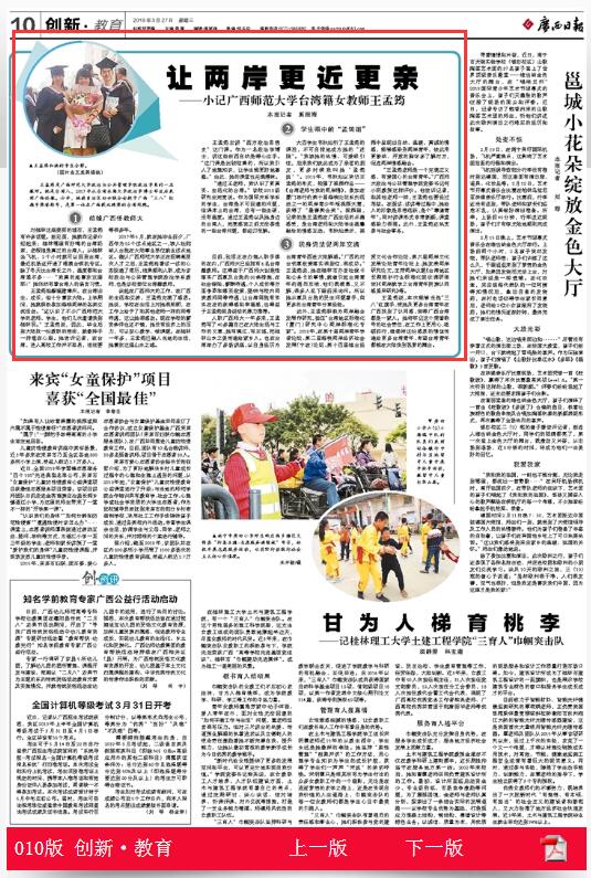 王孟筠说,本次能够当选“三八”红旗手,使她及更多台湾青年在广西找到了认同感,觉得广西台湾都是一家人。她将牢记这个荣誉称号的社会责任,在工作上更用心,砥砺前行,继续将这份感恩的情谊传递给更多台湾青年,希望台湾青年都能在大陆找到筑梦的舞台。(广西日报 2019-03-27 010版 创新·教育 )