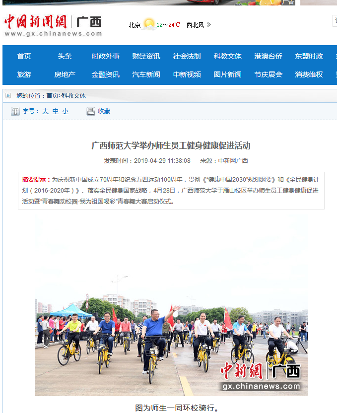 【中新网】广西师范大学举办师生员工健身健康促进活动 发表于 2019-04-30 报道链接:http://www.gx.chinanews.com/kjwt/2019-04-29/detail-ifzhtmpi4236333.shtml