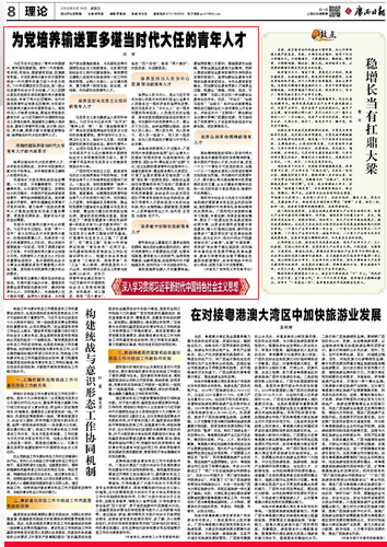 广西师范大学成立之初,就是宣传马列主义和培养革命干部的阵地,为青年政治骨干人才的培养和成长提供了沃土。一直以来,学校党委秉承“培养一批信仰马克思主义的革命青年”的办学思想,高度重视、创新推进优秀青年政治骨干人才的思想引领工作,依托理论人才荟萃、学科基础扎实等优势,聚全校资源努力建设成为全国重点马克思主义学院,集全校力量办好思想政治理论课,建设好思政课程主渠道,探索形成了“课堂专题教学+课后实践研修+网络自主学习+多元教学评价”的四位一体教学新模式;依托全国青年马克思主义培养工程培训研究基地,打造青年马克思主义工程“广西模式”,而“青马工程”实施10年来培养区校院“青马学员”近两万名;依托教育部高校思想政治工作队伍培训研究中心,构建大学生思想政治教育“三维协同、网络贯穿”的“三全”育人格局,特别是党的十八大以来,校领导带头上讲台上形势与政治课120多次,切实引导青年学生真正把学习习近平新时代中国特色社会主义思想往深里走、往实里走、往心里走,树牢“四个意识”,坚定“四个自信”,做到“两个维护”,对党忠诚,永远跟党走。