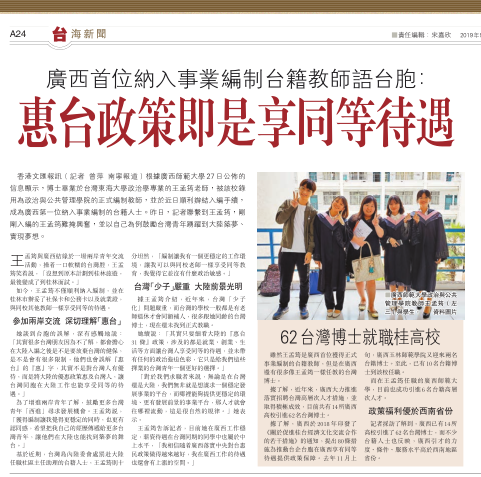 香港文汇报讯(记者 曾萍 南宁报道)根据广西师范大学27日公布的信息显示,博士毕业于台湾东海大学政治学专业的王孟筠老师,被该校录用为政治与公共管理学院的正式编制教师,并于近日顺利办结入编手续, 成为广西第一位纳入事业编制的台籍人士。 昨日,记者联系到王孟筠,刚刚入编的王孟筠难掩兴奋,并以自己为例鼓励台湾青年踊跃到大陆筑梦、实现梦想。