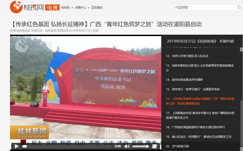 【桂林电视台】传承红色基因 弘扬长征精神 | 广西“青年红色筑梦之旅”活动在灌阳县启动 发表于 2019-06-11 桂视网报道:【传承红色基因 弘扬长征精神】广西“青年红色筑梦之旅”活动在灌阳县启动原文链接:http://tv.gltvs.com/201905/201905312030299716f3249fb443a6_15.shtml