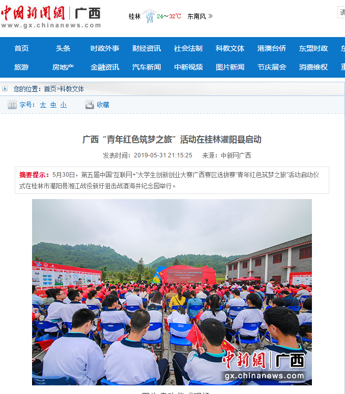 摘要提示:5月30日,第五届中国“互联网+”大学生创新创业大赛广西赛区选拔赛“青年红色筑梦之旅”活动启动仪式在桂林市灌阳县湘江战役新圩狙击战酒海井纪念园举行。