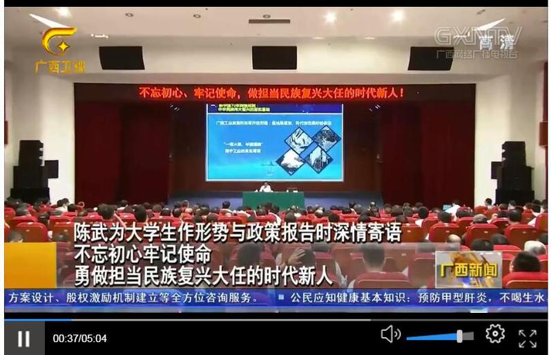 中央部署从今年6月开始,在全党自上而下分两批开展“不忘初心、牢记使命”主题教育。6月4日,我区正式启动主题教育,自治区党委常委刚刚赴湘江战役发生地全州县、兴安县接受革命传统现场教育并开展专题研讨。因此,陈武围绕“中华民族伟大复兴与新时代青年的历史使命”这一主题,引经据典、语重心长,从“新中国70年辉煌成就”到“中国特色社会主义”,从“新时代中国青年”到“放飞青春梦想”,结合广西实际,以精辟的理论和真切的人生感悟,深入浅出地与青年学生们谈历史、讲理想、说使命、话感悟,带给大家许多启迪和思考。