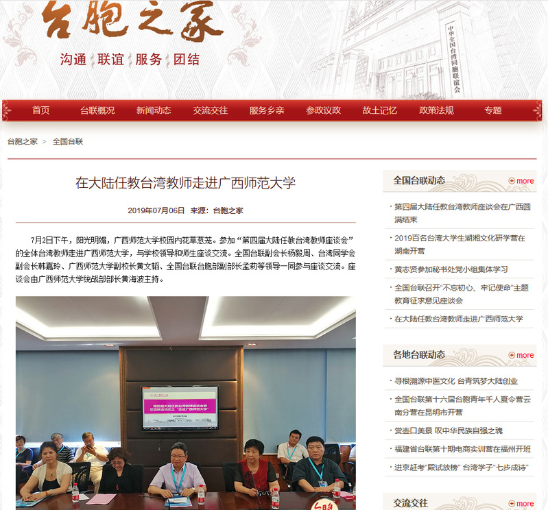 7月2日下午,阳光明媚,广西师范大学校园内花草葱茏。参加“第四届大陆任教台湾教师座谈会”的全体台湾教师走进广西师范大学,与学校领导和师生座谈交流。全国台联副会长杨毅周、台湾同学会副会长韩嘉玲、广西师范大学副校长黄文韬、全国台联台胞部副部长孟莉等领导一同参与座谈交流。座谈会由广西师范大学统战部部长黄海波主持。