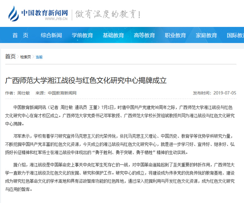 中国教育新闻网讯(记者 周仕敏 通讯员 王董)7月1日,时值中国共产党建党98周年之际,广西师范大学湘江战役与红色文化研究中心在育才校区成立。广西师范大学党委书记邓军教授、广西师范大学校长贺祖斌教授共同为湘江战役与红色文化研究中心揭牌。