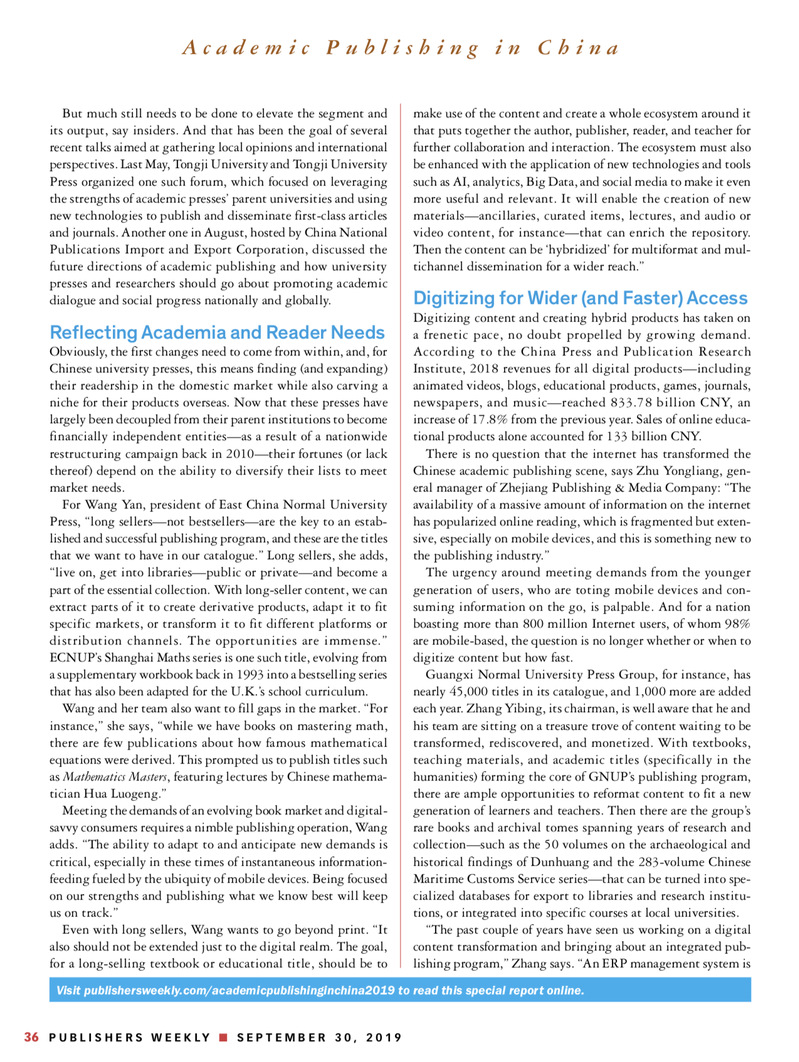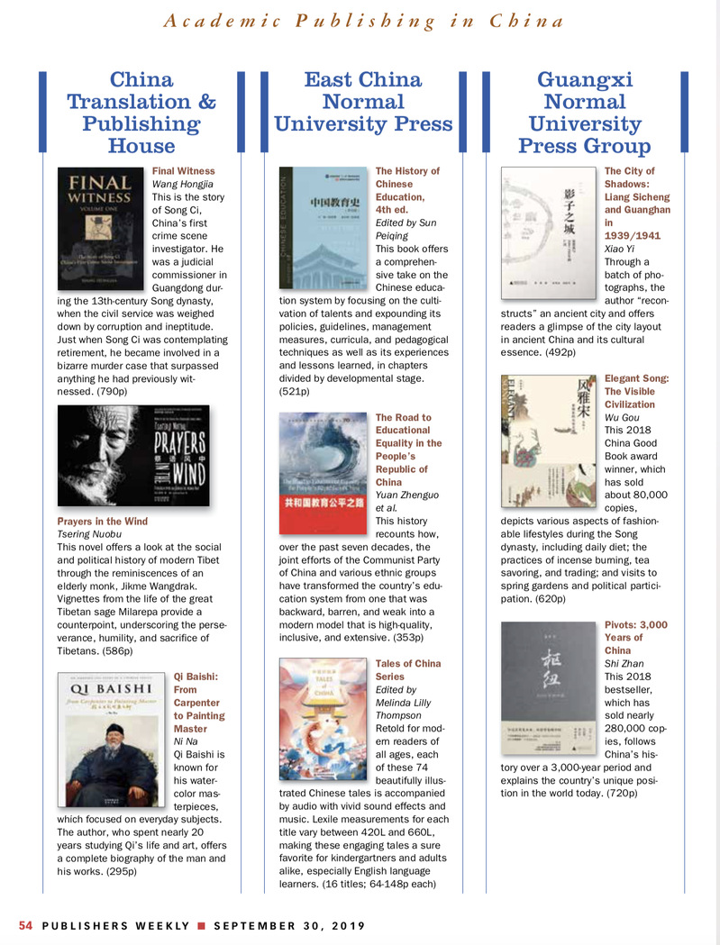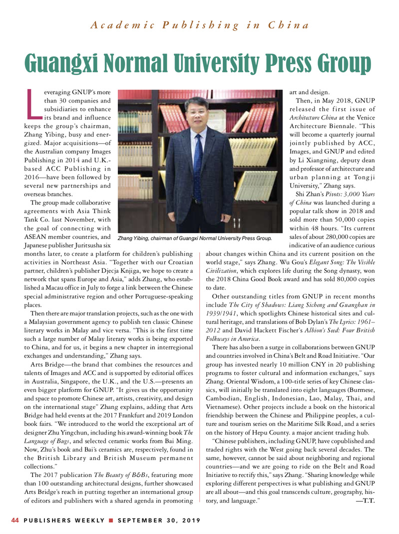 近日,《美国出版商周刊》刊发《Checking on theAcademic Book Market in China》《Guangxi Normal University Press Group》两篇文章。文章聚焦出版社集团自成立以来的各项发展情况,对出版社集团的精品图书、文化品牌运营、数字转型升级、国际化发展等方面工作做了重点介绍。