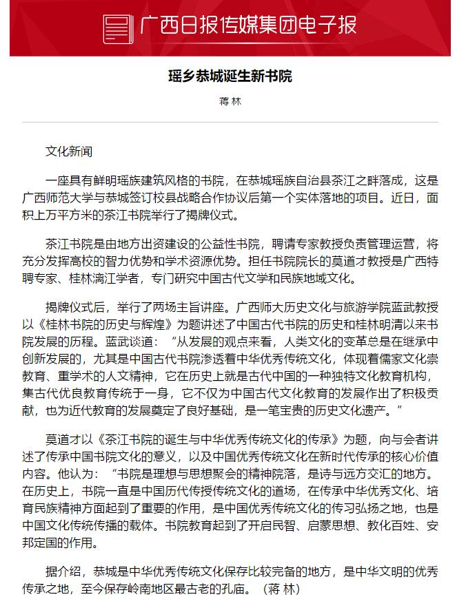 茶江书院是由地方出资建设的公益性书院,聘请专家教授负责管理运营,将充分发挥高校的智力优势和学术资源优势。担任书院院长的莫道才教授是广西特聘专家、桂林漓江学者,专门研究中国古代文学和民族地域文化。
