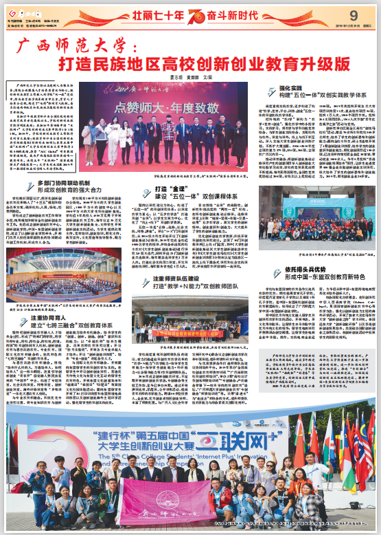 广西师范大学努力开创创新创业教育工作新局面。通过多年的建设,学校连续多年被评为全区高校毕业就业工作先进单位,学生在“互联网+”“挑战杯”“创青春”等各类学科竞赛、创新创业大赛中成绩均居广西高校前列。
