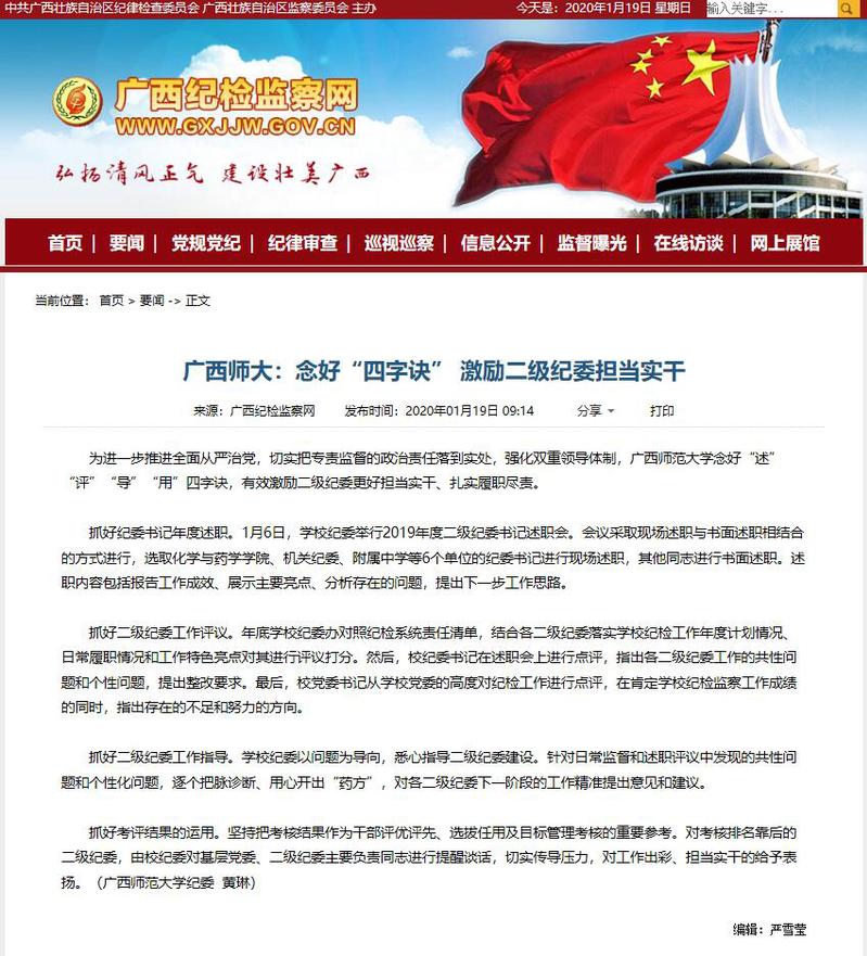 1月19日,广西纪检监察网刊发文章《广西师大:念好“四字诀”激励二级纪委担当实干》。现将文章分享如下: