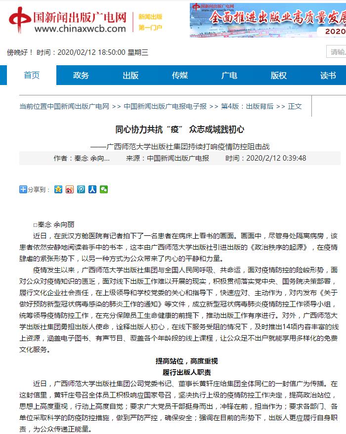 建立科学防控机制,保障出版工作顺利开展。为确保疫情防控与出版业务工作两不误,广西师范大学出版社集团深入分析研判防控形势,积极处理好疫情防控与业务工作关系,1月30日,印发《关于调整2020年春节假期后延期上班有关事项的通知》;2月6日,印发《关于调整疫情防控期间员工考勤方式的通知》。目前,广西师范大学出版社集团已经建立“一人一档”健康管控制度,并制定发布《防疫期间上班十方面防控措施》,通过采取部分员工在岗值班、部分员工线上办公的柔性上班模式,在全力打好防控疫情攻坚战的同时,保障出版工作有序开展。