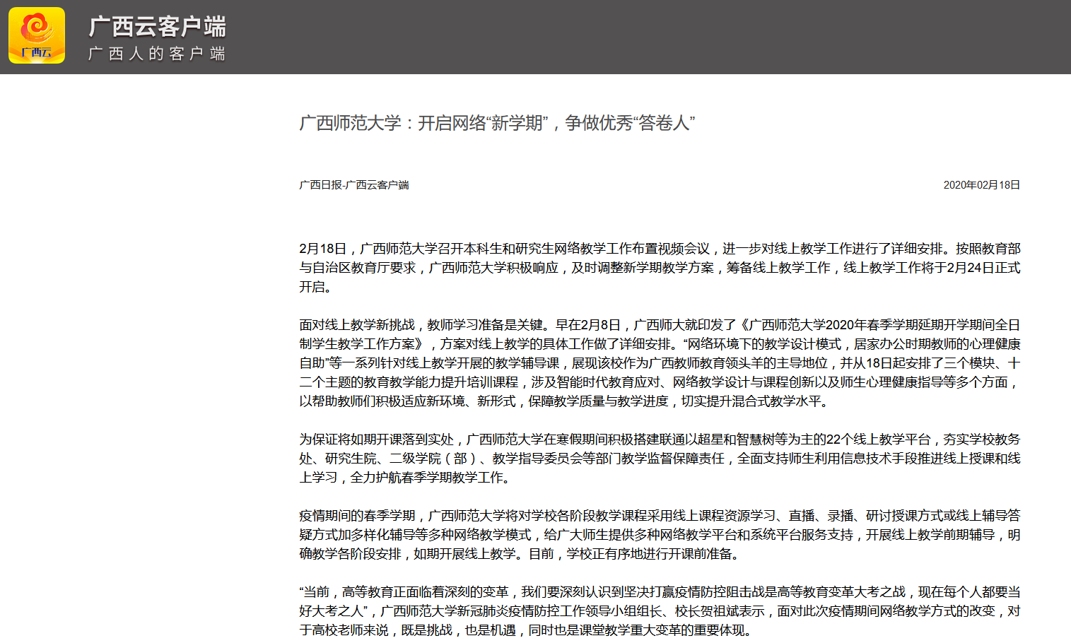 “当前,高等教育正面临着深刻的变革,我们要深刻认识到坚决打赢疫情防控阻击战是高等教育变革大考之战,现在每个人都要当好大考之人”,广西师范大学新冠肺炎疫情防控工作领导小组组长、校长贺祖斌表示,面对此次疫情期间网络教学方式的改变,对于高校老师来说,既是挑战,也是机遇,同时也是课堂教学重大变革的重要体现。