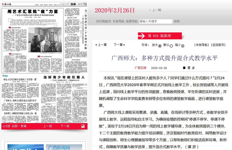 广西师大线上课程采用慕课、录播、直播、在线研讨等多种方式,依教学安排开展线上教学、远程指导和自主学习。为确保疫情防控期间“停课不停学、停课不停教”,该校于2月18日开启为期一周的线上教学辅导课,为全体教师提供三个模块、十二个主题的教育教学能力提升培训课程,涉及智能时代教育应对、网络教学设计与课程创新、师生心理健康指导等多个方面,以帮助教师们积极适应新环境、新形式,保障教学质量与教学进度,提升混合式教学水平。
