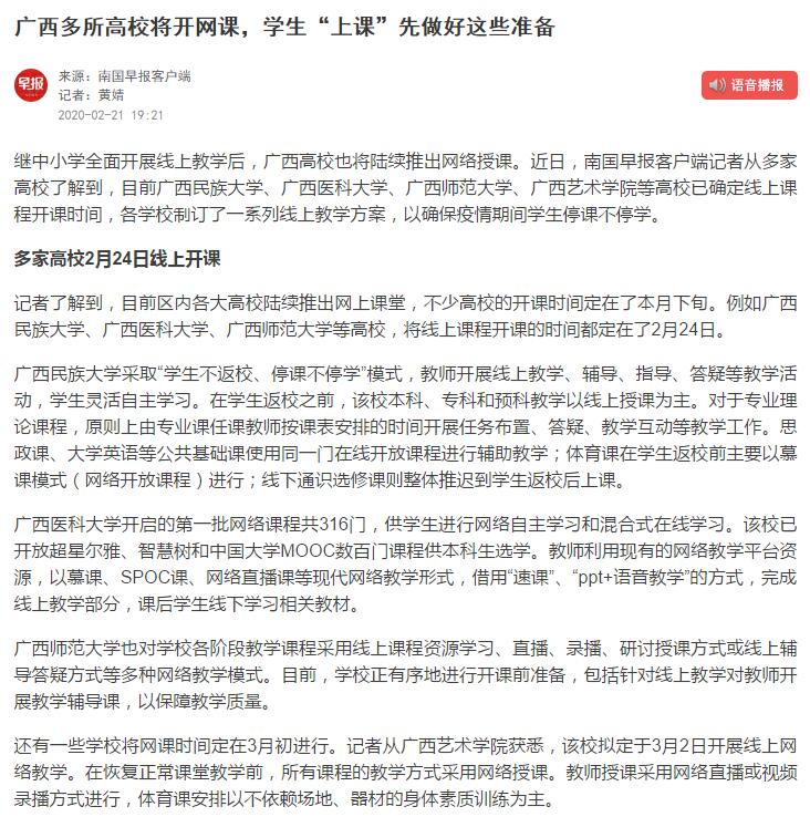 记者了解到,目前区内各大高校陆续推出网上课堂,不少高校的开课时间定在了本月下旬。例如广西民族大学、广西医科大学、广西师范大学等高校,将线上课程开课的时间都定在了2月24日。