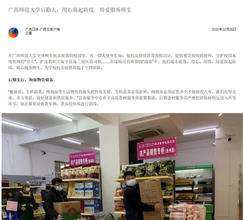 广西师范大学后勤保障处/后勤服务集团副处长邓海军表示,后勤疫情防控工作正在有序推进,制定并不断完善《后勤疫情防控工作方案》《后勤疫情防控应急预案》,出台了《防控疫情物资领、使用规范》办法,每天各部门认真做好工作日记,实行责任区域网格化管理,对每一网格实施动态、全方位管理,提高工作效率;采取定期不定期地对各项疫情防控工作进行纵向、横向的监督检查,加强监督指导,强化执纪问责,确保各项工作做细做实。“我们后勤人将不折不扣地贯彻落实好‘两严防两确保’和‘十严格’的要求,用心服务师生,用情关爱学生,用力严防死守”。