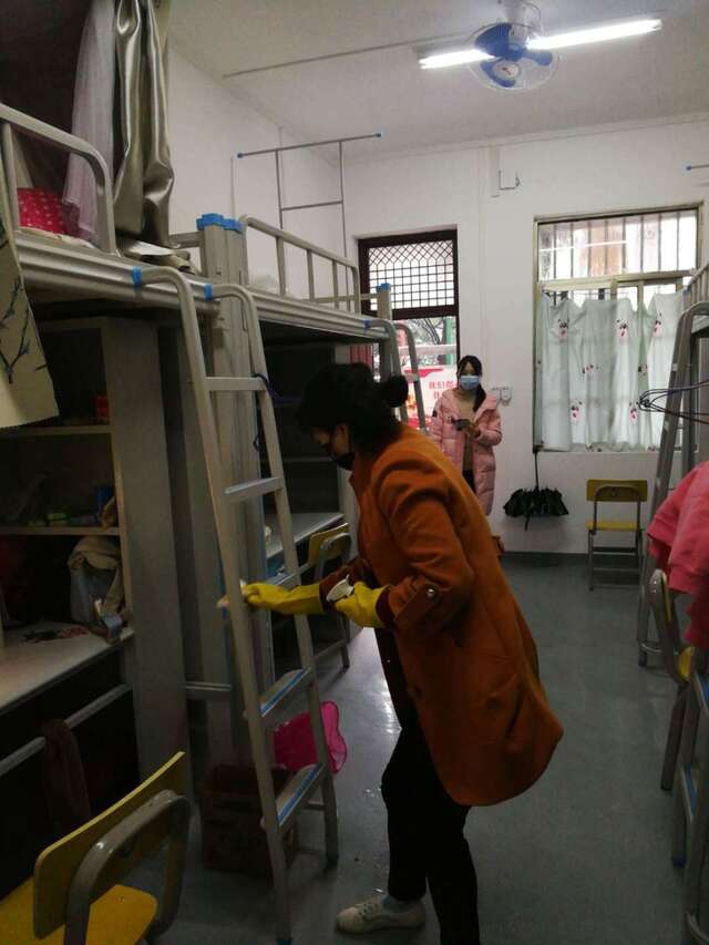 在做好日常环境清洁的基础上,后勤保障处/后勤服务集团加强对教学楼、行政楼、家属区住宅楼内教室、学生宿舍、员工宿舍、卫生间等重点区域的消毒频次,采用“喷洒消毒、酒精擦拭”等多种消杀方式;同时,特别加强了对门把手、水龙头、电梯按钮、楼梯扶手等人群高频次接触物体表面的消毒。