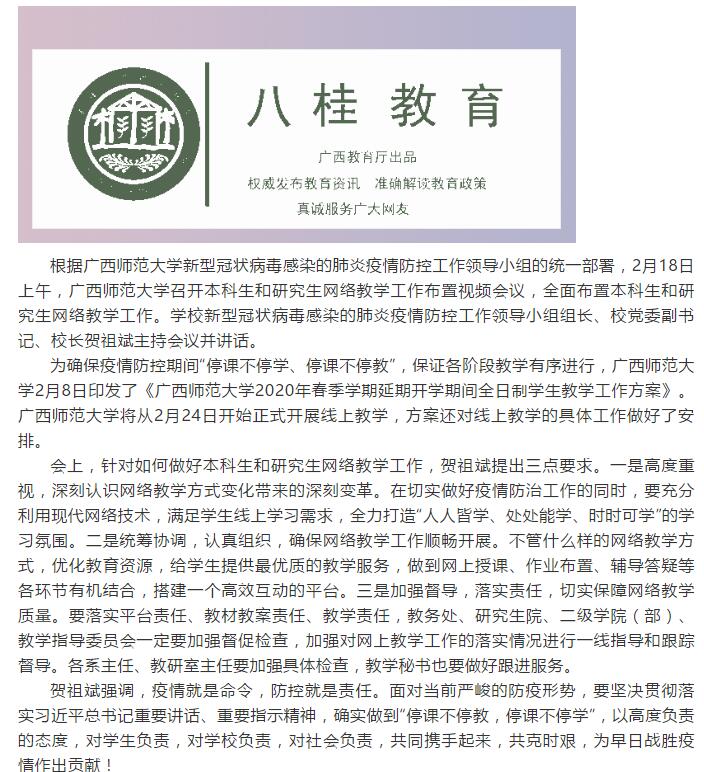 为确保疫情防控期间“停课不停学、停课不停教”,保证各阶段教学有序进行,广西师范大学2月8日印发了《广西师范大学2020年春季学期延期开学期间全日制学生教学工作方案》。广西师范大学将从2月24日开始正式开展线上教学,方案还对线上教学的具体工作做好了安排。