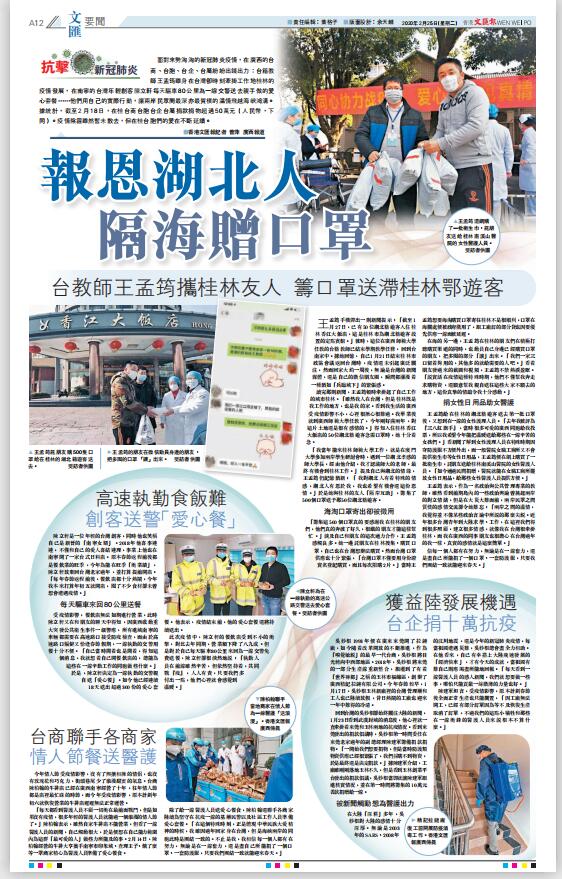 面對來勢洶洶的新冠肺炎疫情,在廣西的台商、台胞、台企、台屬紛紛出錢出力:台籍教師王孟筠雖身在台灣卻時刻牽掛工作地桂林的疫情發展,在南寧的台灣年輕創客陳立軒每天驅車80公里為一線交警送去親手做的愛心套餐......他們用自己的實際行動,讓兩岸民眾間最深亦最質樸的溫情飛越海峽鴻溝。據統計,截至2月18日,在桂台商台胞台企台屬捐款捐物超過50萬元(人民幣,下同)。疫情陰霾雖然暫未散去,但在桂台胞們的愛在不斷延續。