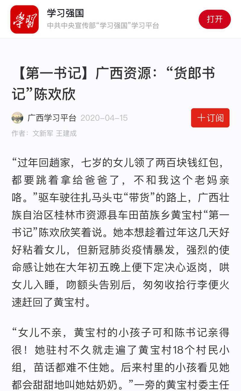 4月15日,学习强国客户端以《【第一书记】广西资源:“货郎书记”陈欢欣》为题,报道我校派驻黄宝村的第一书记陈欢欣在新冠肺炎疫情期间奔赴桂林市资源县车苗族乡黄宝村“带货”扶贫的事迹。