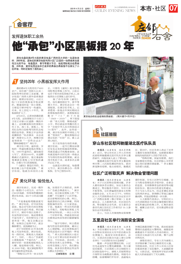 4月22日,桂林晚报以《他“承包”小区黑板报20年》为题,报道我校退休党员教师黄宗佑老师疫情宣传的先进事迹。