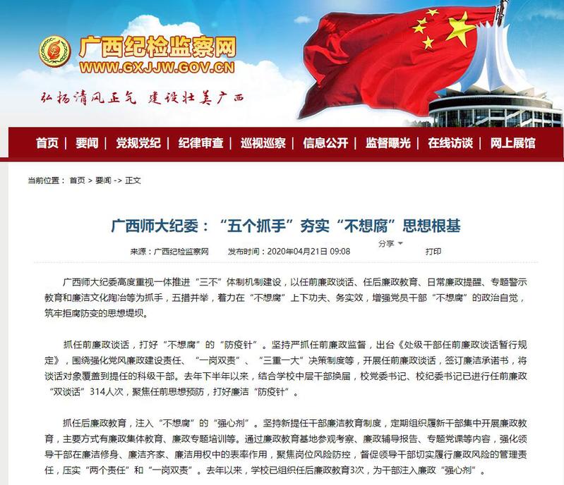 广西师大纪委高度重视一体推进“三不”体制机制建设,以任前廉政谈话、任后廉政教育、日常廉政提醒、专题警示教育和廉洁文化陶冶等为抓手,五措并举,着力在“不想腐”上下功夫、务实效,增强党员干部“不想腐”的政治自觉,筑牢拒腐防变的思想堤坝。