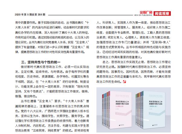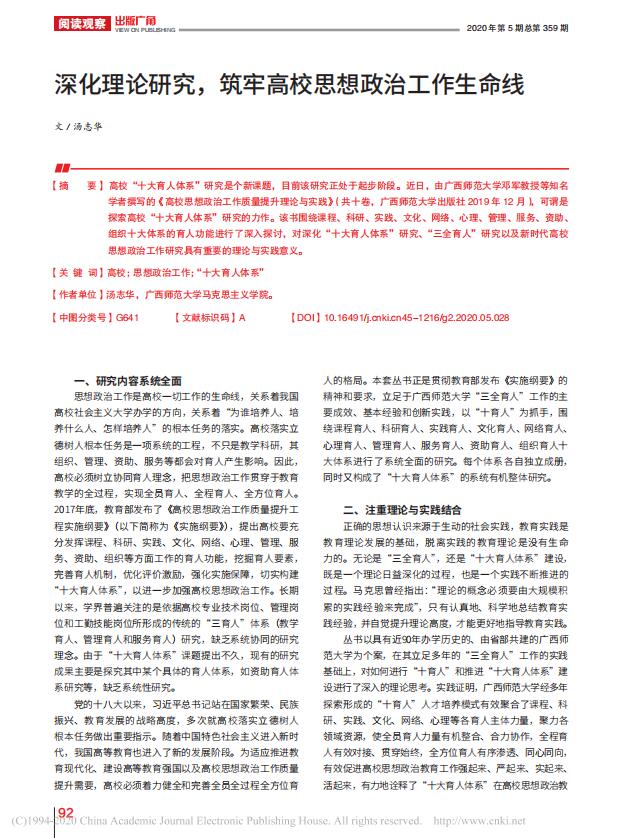 【出版广角】刊登汤志华教授书评《深化理论研究,筑牢高校思想政治工作生命线》 发表于 2020-04-30 4月29日,《出版广角》刊登了我校马克思主义学院汤志华教授对《高校思想政治工作质量提升理论与实践》的书评《深化理论研究,筑牢高校思想政治工作生命线》。文章指出,思想政治工作是高校一切工作的生命线,关系着我国高校社会主义大学办学的方向,关系着“为谁培养人、培养什么人、怎样培养人”的根本任务的落实。要深化理论研究,筑牢高校思想政治工作生命线,必须做到研究内容系统全面,注重理论与实践结合,坚持共性与个性的统一。