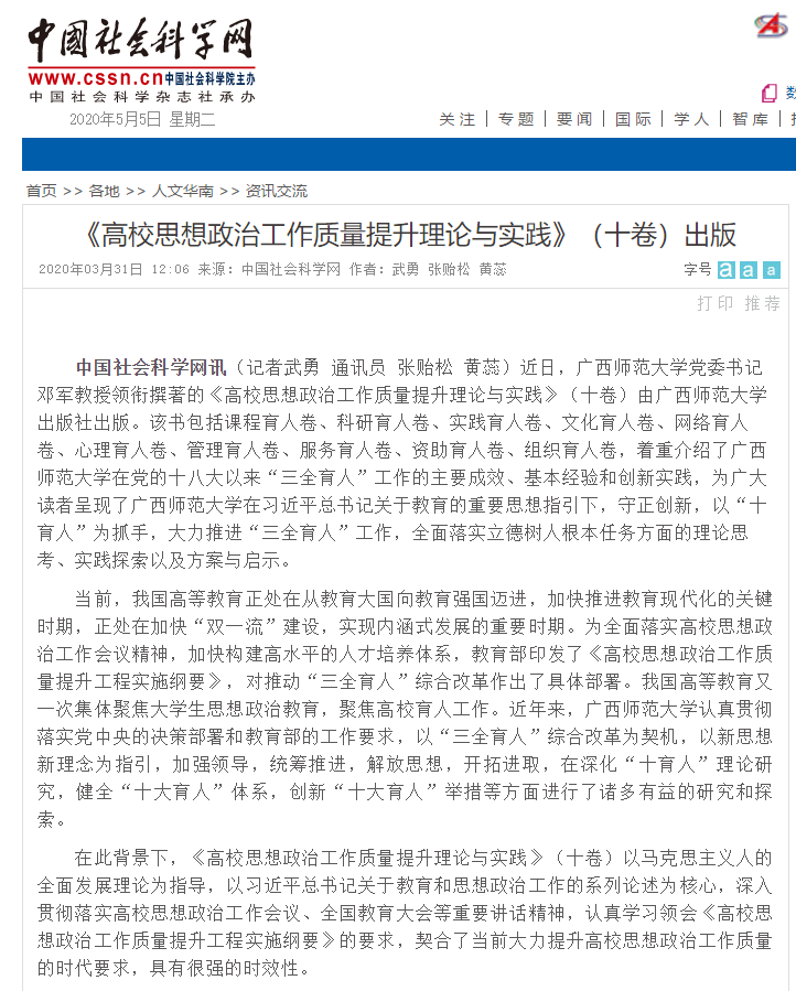 中国社会科学网讯(记者武勇 通讯员 张贻松 黄蕊)近日,广西师范大学党委书记邓军教授领衔撰著的《高校思想政治工作质量提升理论与实践》(十卷)由广西师范大学出版社出版。该书包括课程育人卷、科研育人卷、实践育人卷、文化育人卷、网络育人卷、心理育人卷、管理育人卷、服务育人卷、资助育人卷、组织育人卷,着重介绍了广西师范大学在党的十八大以来“三全育人”工作的主要成效、基本经验和创新实践,为广大读者呈现了广西师范大学在习近平总书记关于教育的重要思想指引下,守正创新,以“十育人”为抓手,大力推进“三全育人”工作,全面落实立德树人根本任务方面的理论思考、实践探索以及方案与启示。