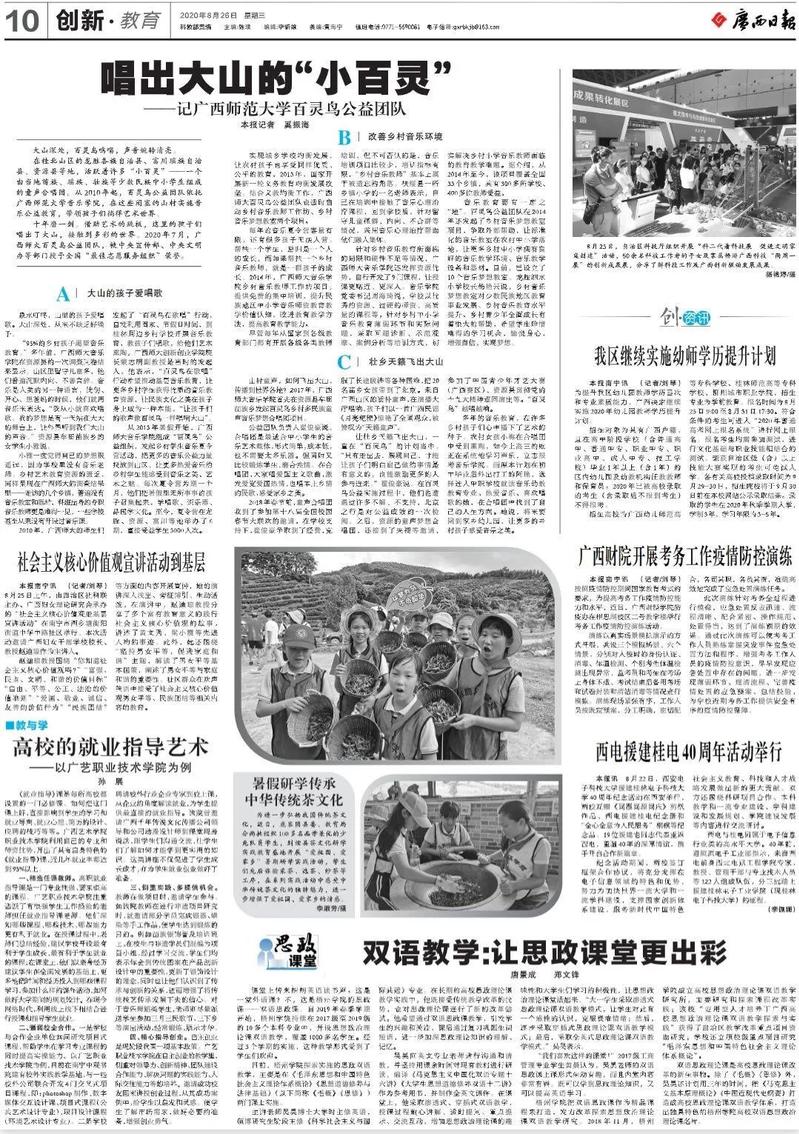 8月28日,广西日报发表文章《唱出大山的“小百灵”——记广西师范大学百灵鸟公益团队》,广西云、“学习强国”广西学习平台转载该文章。文章写出了大山深处孩子们百灵鸟般的童声,体现出了我校百灵鸟公益团队对乡村音乐教育做出的贡献。