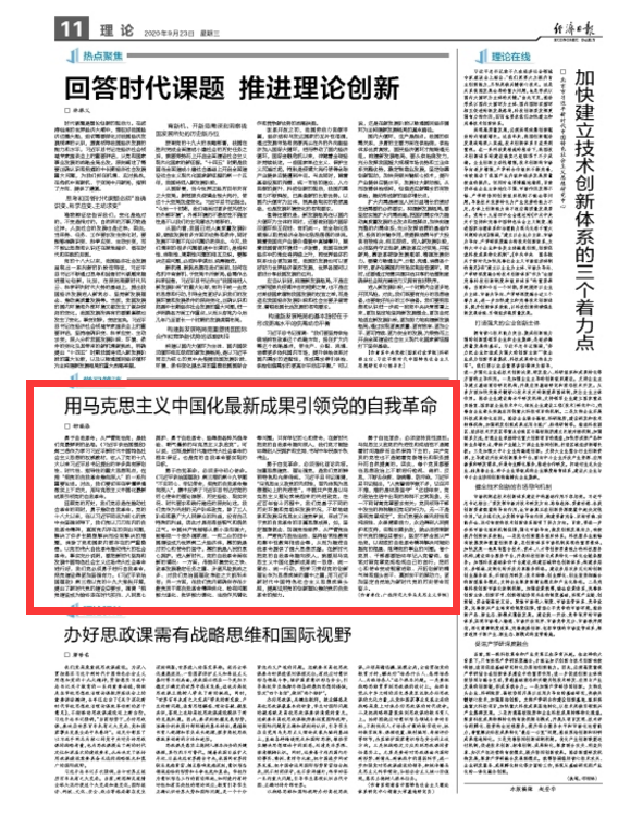 9月23日,经济日报第十一版刊登我校钟瑞添教授理论文章《用马克思主义中国化最新成果引领党的自我革命》,文章指出,勇于自我革命,从严管党治党,是我们党最鲜明的品格,我们要切实在学懂弄通做实上下功夫,用马克思主义中国化最新成果引领党的自我革命。文章从勇于自我革命,必须坚守初心使命、勇于自我革命,必须强化理论武装、勇于自我革命,必须坚持党性原则三个方面深入解读了《习近平谈治国理政》第三卷以党的十九大报告开篇提出的新时代党的建设总要求,强调“把党建设成为始终走在时代前列、人民衷心拥护、勇于自我革命、经得起各种风浪考验、朝气蓬勃的马克思主义执政党”的重大思想观点及新境界。