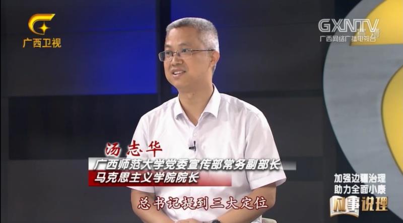 我校汤志华教授做客广西卫视“凡事说理”节目探讨加强边疆治理与助力全面小康 发表于 2020-09-30 2020年9月27日,我校党委宣传部常务副部长、马克思主义学院院长汤志华教授做客广西卫视“凡事说理”节目。同时参加节目的还有原国防大学少将、天津师范大学马克思主义学院院长颜晓峰教授。本次访谈主要围绕全面小康与边疆治理的理论研讨会议题,对边疆治理如何助力全面小康、广西作为边疆民族地区面临着哪些优势和挑战等话题进行了探讨。 报道链接:https://vod.gxtv.cn/video/videoShow_02a7feb4fed943f8b1fb5ffe953cd576.html 报道截图:
