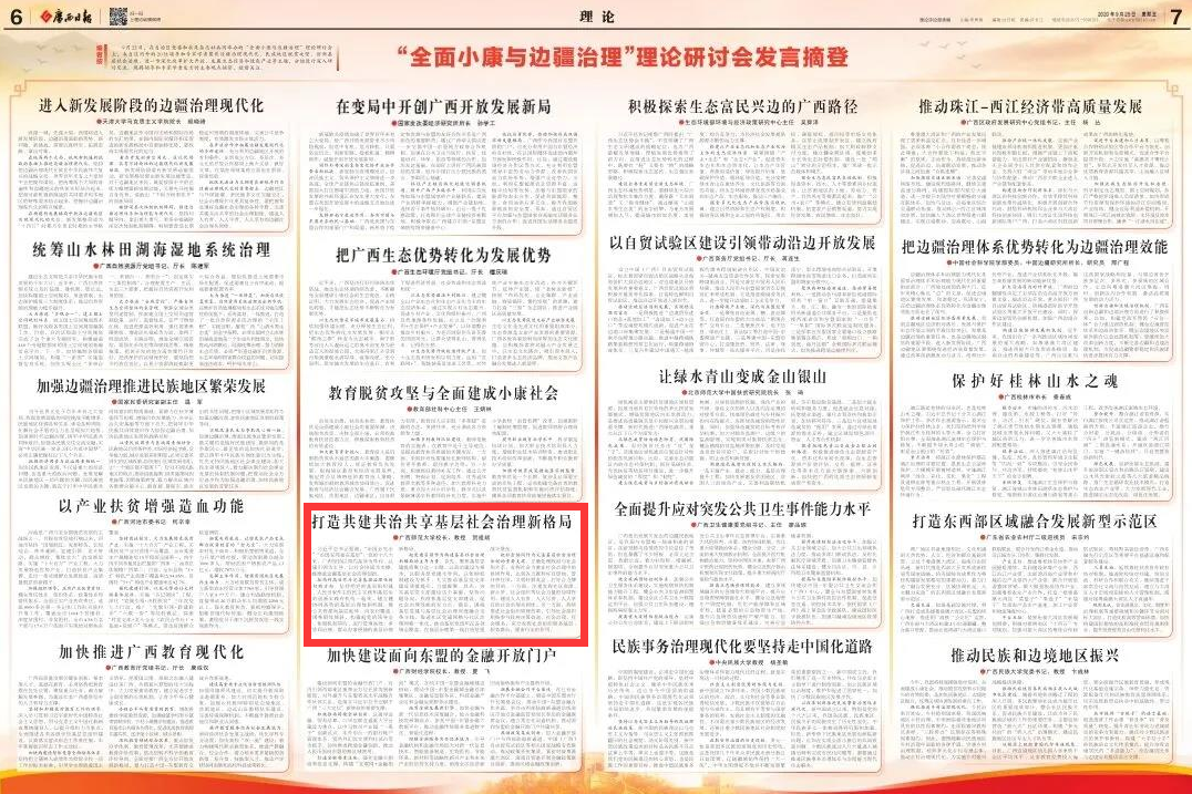 《广西日报》2020年9月25日第6版摘登了我校校长贺祖斌教授在“全面小康与边疆治理”理论研讨会的发言《打造共建共治共享基层社会治理新格局》