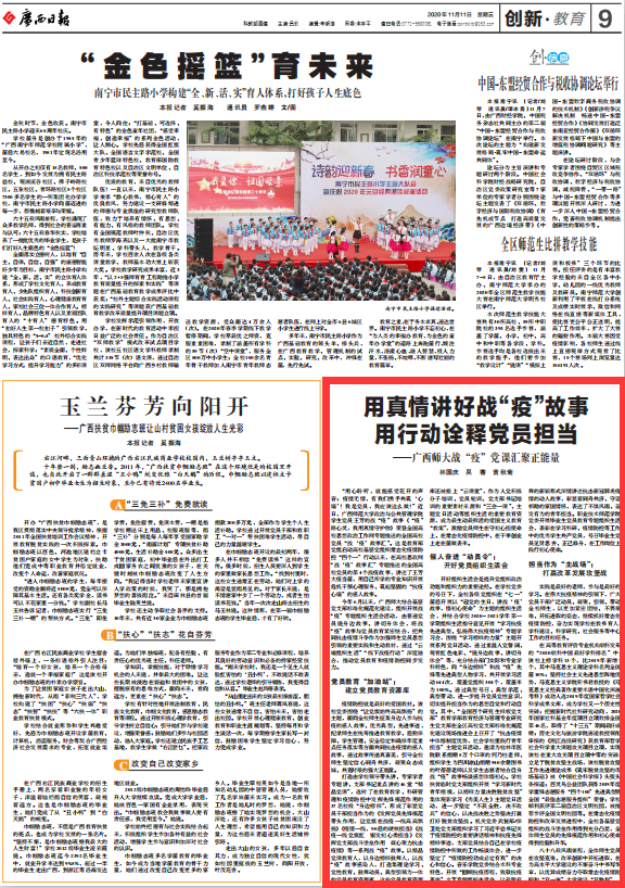 11月11日,广西日报09版以《用真情讲好战“疫”故事 用行动诠释党员担当——广西师大战“疫”党课汇聚正能量》为题报道我校讲好战“疫”党课的经验做法。