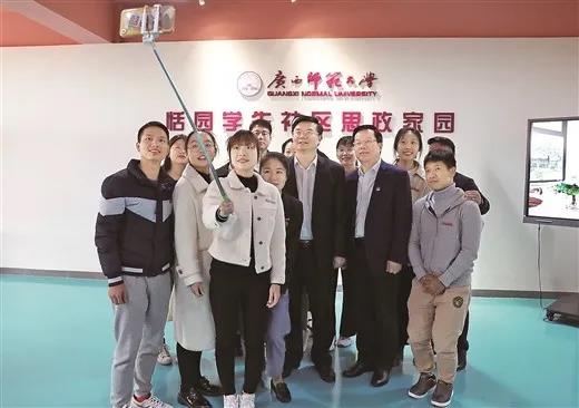 2020年11月23日,自治区宣讲团到广西师范大学宣讲党的十九届五中全会精神,并在恬园学生社区学生之家和学生座谈交流并合影