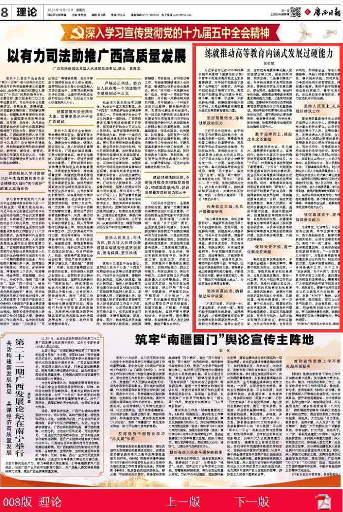 2020年12月10日,《广西日报》第8版刊登我校校长贺祖斌文章《练就推动高等教育内涵式发展过硬能力》。文章强调,高校年轻干部要坚持以问题为导向,想干事、能干事、干成事,不断在解决问题、破解难题中提升能力本领,为推动高等教育高质量内涵式发展贡献智慧和力量。