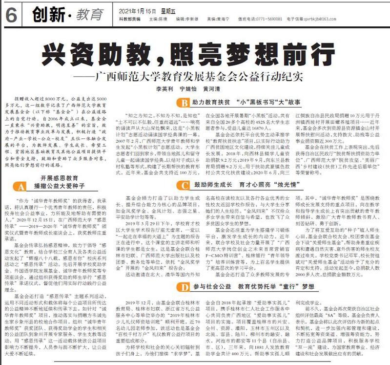 12月15日,《广西日报》第6版头条报道我校教育发展基金会公益行动。文章从开展感恩教育、助力教育扶贫、鼓励师生成长、参与社会公益等方面,介绍了我校教育发展基金会积极打造“政府-产业-学校-公众-校友”五位一体融合发展的平台,为教师发展、学生成长、希望工程、贫困地区基础教育及其他公益项目提供平台和资金支持所取得的成绩。