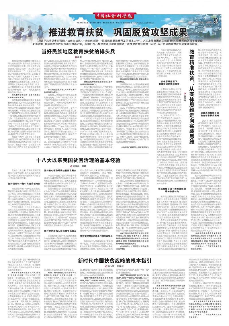 2021年1月15日,《中国社会科学报》第9版刊发专题《推进教育扶贫 巩固脱贫攻坚成果》。我校党委书记邓军教授与我校马克思主义学院部分教师分别撰文,阐述教育扶贫经验和相关理论研究成果。其中,邓军教授以《当好民族地区教育扶贫的排头兵》为题,从依托教育资源优势,促进民族地区农村基础教育发展;加大科技扶贫力度,竭力为贫困对象提供智力帮扶;聚焦文化和旅游扶贫新领域,助力县域旅游经济腾飞;顺应经济发展新格局,探索消费扶贫新模式进行了深入浅出地分析阐释。