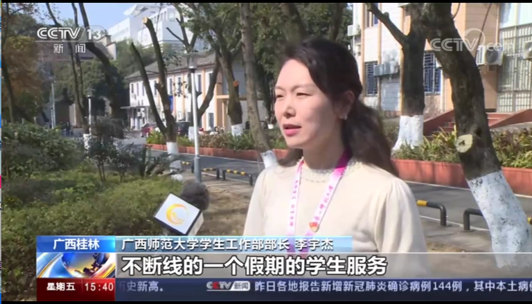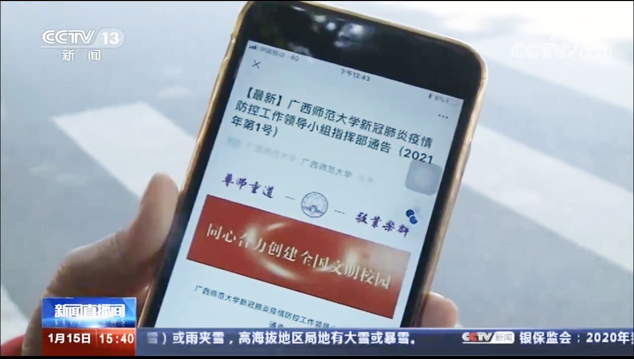 1月15日,央视新闻频道《新闻直播间》关注报道了我校寒假期间对留校学生提供统一住宿和管理,并开展学习辅导;对确定离校回家的学生提倡错峰离校、发放“防疫温暖包”,持续开展包括学生心理咨询、就业指导安排、学业辅导等“不断线”式学生服务。