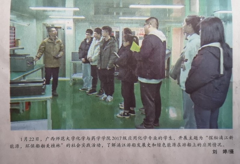 【广西日报】报道我校开展“探秘漓江新能源,环保船舶美桂林”的社会实践活动 发表于 2021-01-29 1月28日,《广西日报》第12版以图片新闻的方式报道我校化学与药学学院2017级应用化学专业开展主题为“探秘漓江新能源,环保船舶美桂林”的社会实践活动,了解漓江游船发展史和绿色能源在游船上的应用情况。 报道截图:报道链接:http://gxrb.gxrb.com.cn/html/2021-01/28/content_1746671.htm