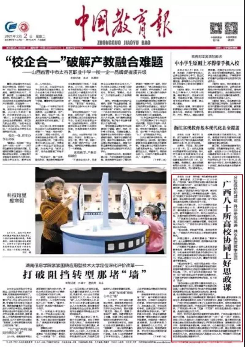 2月2日,《中国教育报》头版以《广西八十所高校协同上好思政课》为题,关注报道我校马克思主义学院牵头广西“思政课多层级结对共建行动”取得的阶段性成果。