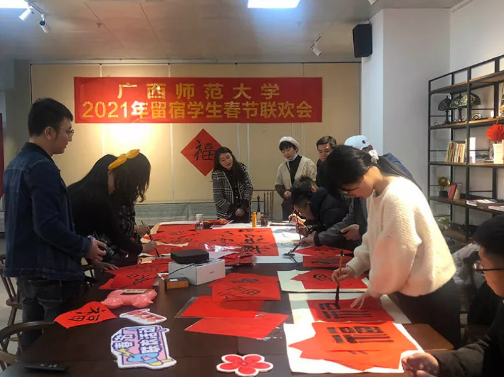 2月11日,农历除夕之日,广西师范大学12位留校师生齐聚育才校区红豆小馆(校友之家),迎接新年的到来。该校党委书记邓军、校长贺祖斌现场视频连线,为留宿师生送上新春祝福。