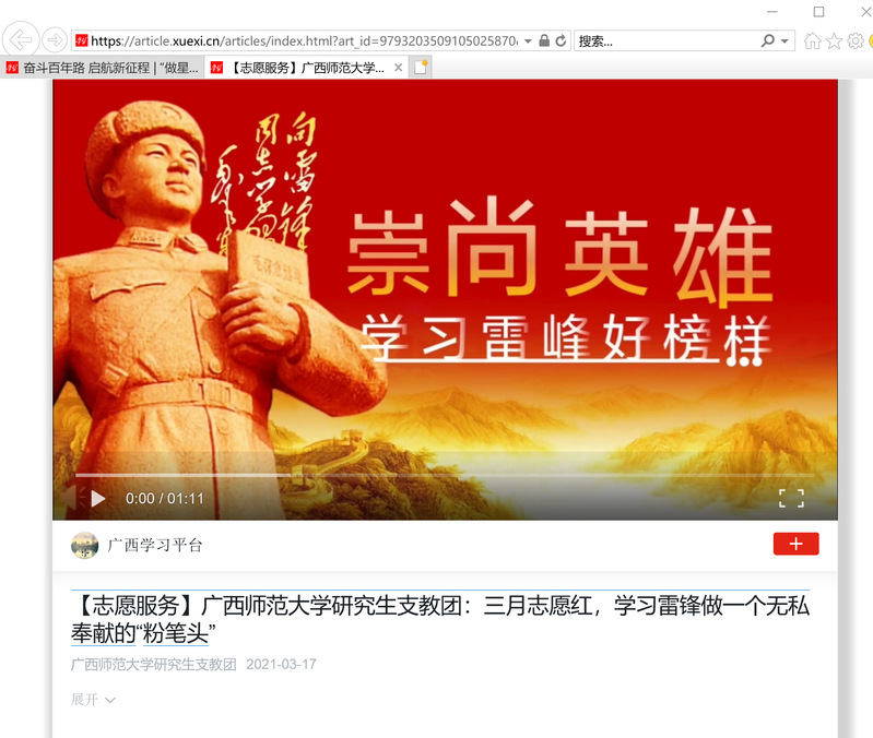 3月17日,学习强国平台以《【志愿服务】广西师范大学研究生支教团:三月志愿红,学习雷锋做一个无私奉献的“粉笔头”》刊播我校研究生支教团学习雷锋的视频。现将报道分享如下: