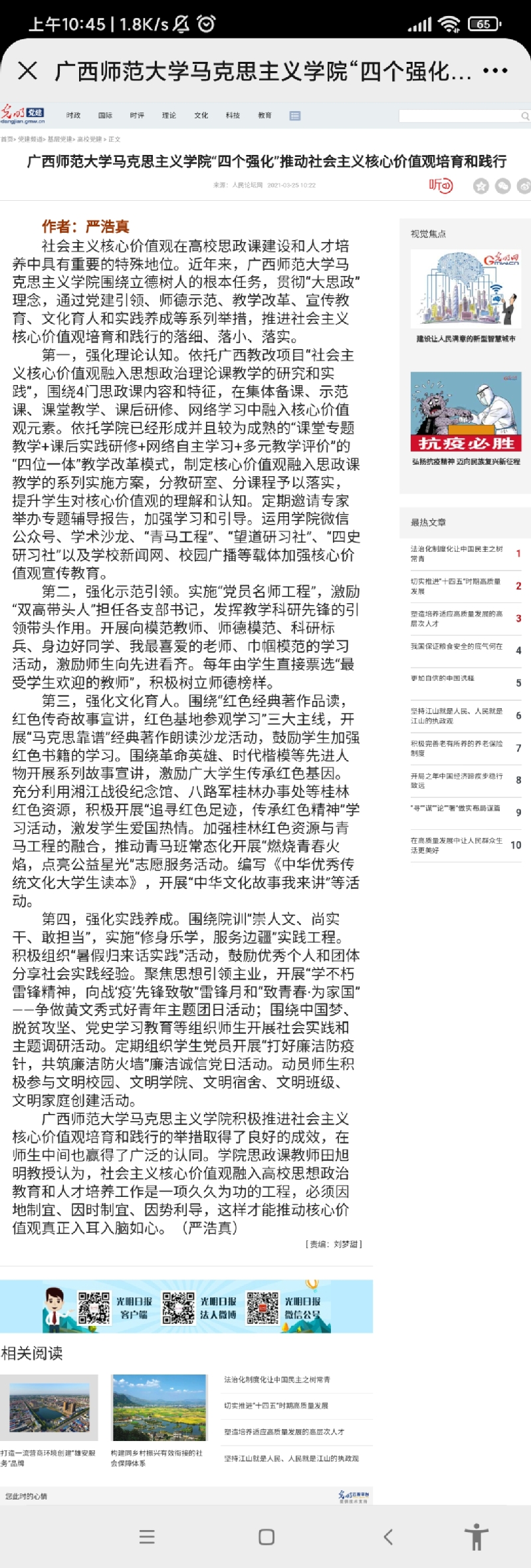 3月24日,人民论坛、光明网以《广西师范大学马克思主义学院“四个强化”推动社会主义核心价值观培育和践行》为题,报道我校马克思主义学院围绕立德树人的根本任务,贯彻“大思政”理念,通过党建引领、师德示范、教学改革、宣传教育、文化育人和实践养成等系列举措,推进社会主义核心价值观培育和践行的落细、落小、落实的经验做法。