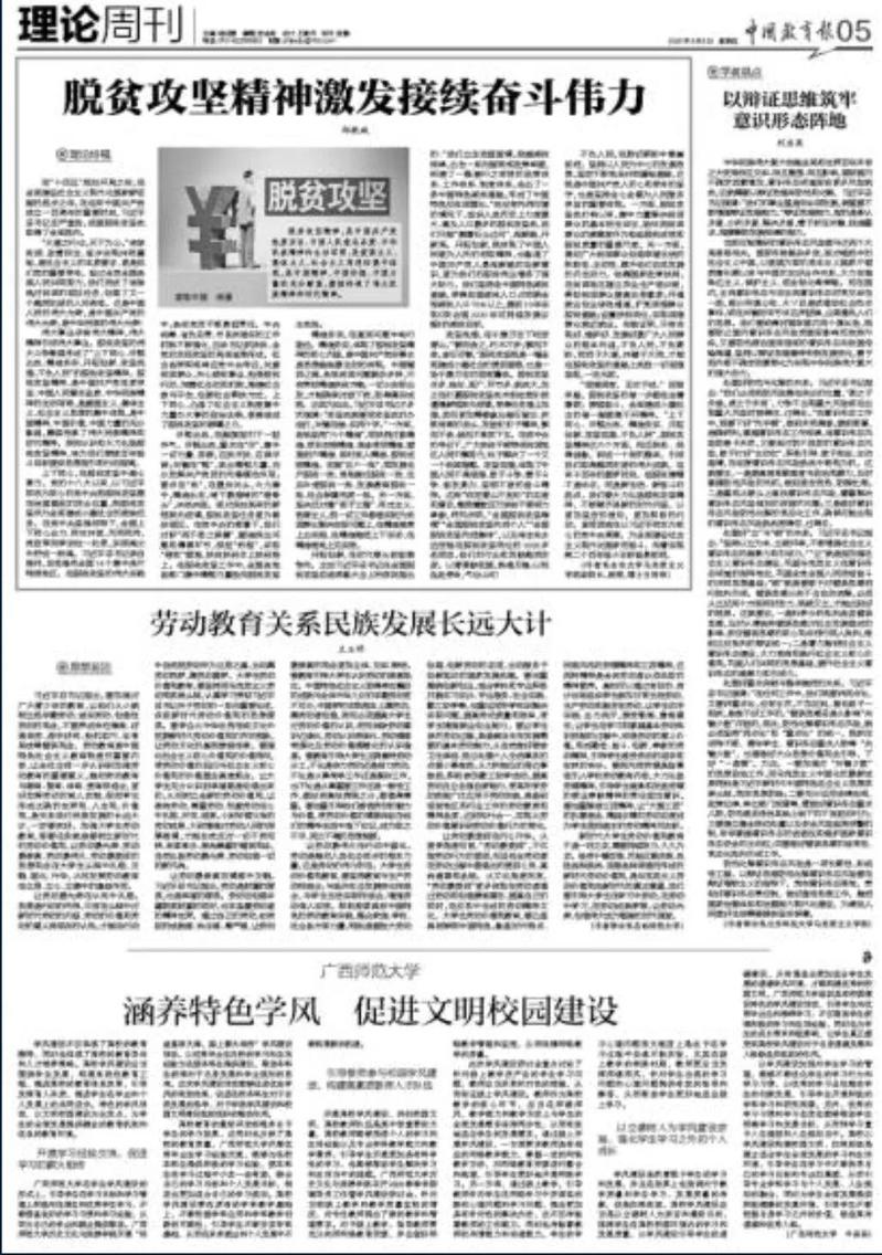 4月8日,《中国教育报》第5版刊发文章《广西师范大学:涵养特色学风 促进文明校园建设》。文章从“开展学习经验交流,促进学习的薪火相传”“引导教师参与校园学风建设,构建高素质教师人才队伍”“以立德树人为学风建设宗旨,强化学生学习之外的个人成长”三方面进行论述,关注我校涵养特色学风经验做法。
