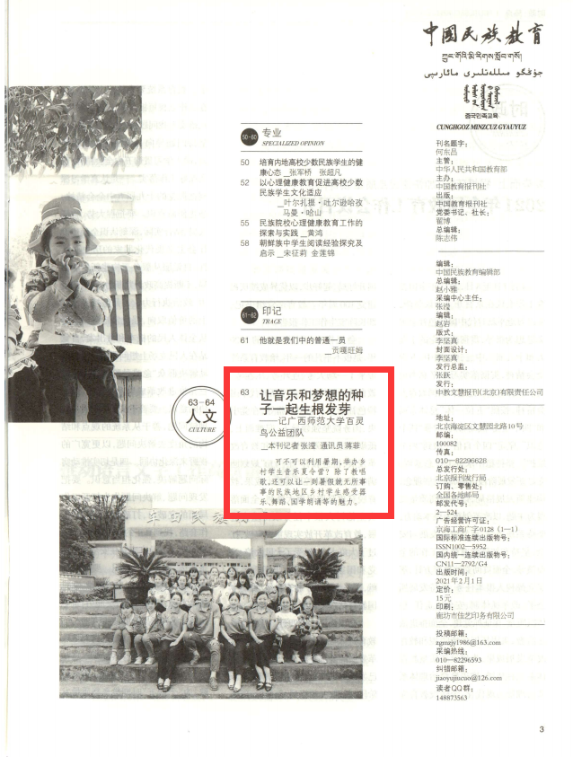 2021年3月,《中国民族教育》第二期以《让音乐和梦想的种子一起生根发芽——记广西师范大学百灵鸟公益团队》为题关注报道我校百灵鸟公益团队先进事迹。据了解,《中国民族教育》是由中华人民共和国教育部主管,中国教育报刊社主办。