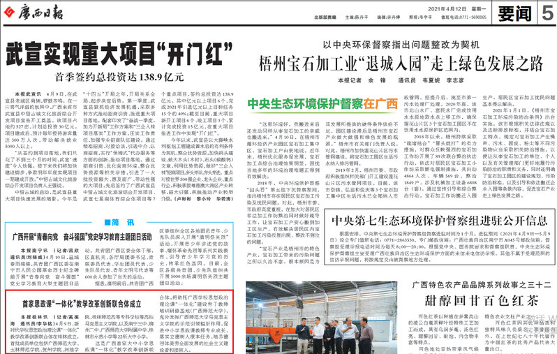 【广西日报】首家思政课“一体化”教学改革创新联合体成立 发表于 2021-04-13 4月12日,广西日报在第5版报道了首家思政课“一体化”教学改革创新联合体在我校成立的新闻。报道截图:报道链接:http://gxrb.gxrb.com.cn/html/2021-04/12/content_1760552.htm