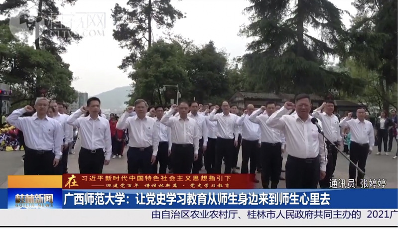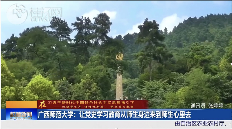 4月13日,桂林电视台《桂林新闻》栏目以《广西师范大学:让党史学习教育从师生身边来到师生心里去》为题,刊播我校赴遵义开展党史学习教育相关视频,报道提到,我校创新学习形式,将党史学习教育融入师生日常学习工作中,让党史学习教育从师生身边来到师生心里去,实现“规定动作”与“自选动作”相结合。