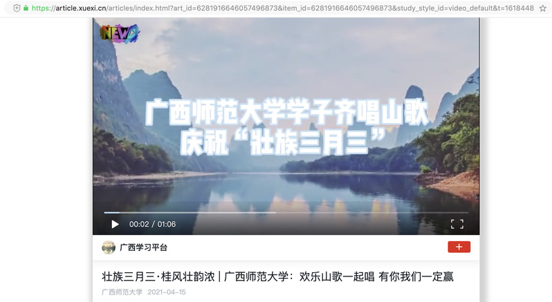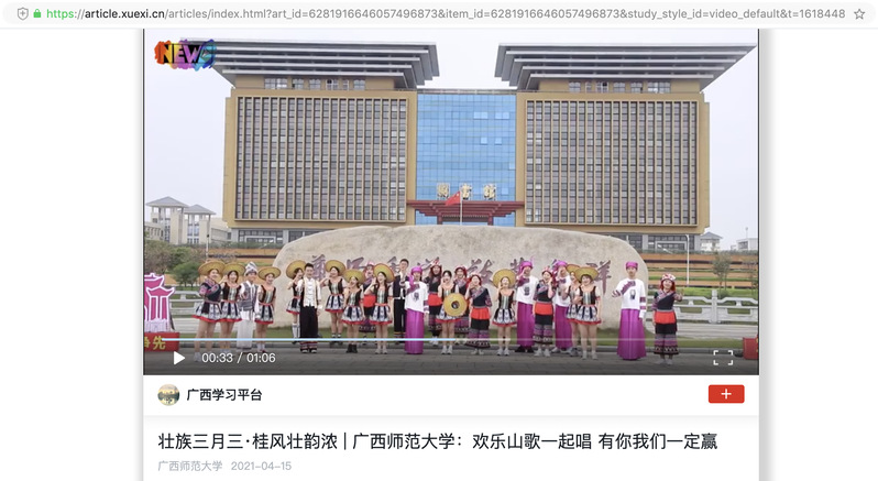 4月15日,学习强国平台以《壮族三月三·桂风壮韵浓 | 广西师范大学:欢乐山歌一起唱 有你我们一定赢》刊播我校开展喜迎“壮族三月三”校园快闪活动,用独具特色的民族风情庆祝壮族“三月三”节日。现将报道分享如下: