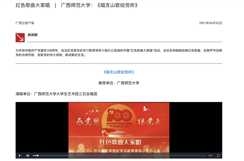4月22日,广西云客户端刊播我校《唱支山歌给党听》参加自治区党委党史学习教育领导小组办公室组织开展的“红色歌曲大家唱”活动。在歌声中回顾党的光辉历程,讴歌党的伟大成就,歌颂美好生活。现将报道分享如下: