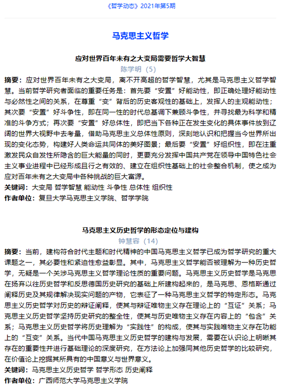 《哲学动态》(月刊)创刊于1978年,是由中国社会科学院哲学研究所主办的全国性哲学专业刊物,是国内一流的哲学专业刊物,为我校认定的A类刊物。马院青年教师的学术论文在该刊物发表,充分体现了学院加强师资队伍建设、提升青年教师科研能力工程以及强化马克思主义理论学科建设取得的阶段性成效。
